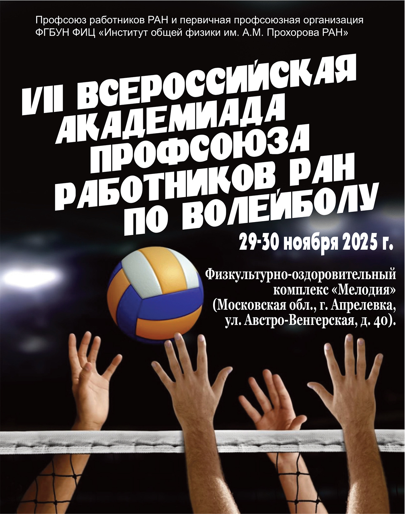 VII Всероссийская Академиада Профсоюза работников РАН по волейболуДаты проведения: 29–30 ноября 2025 годаОрганизаторы: Профсоюз работников РАН и...